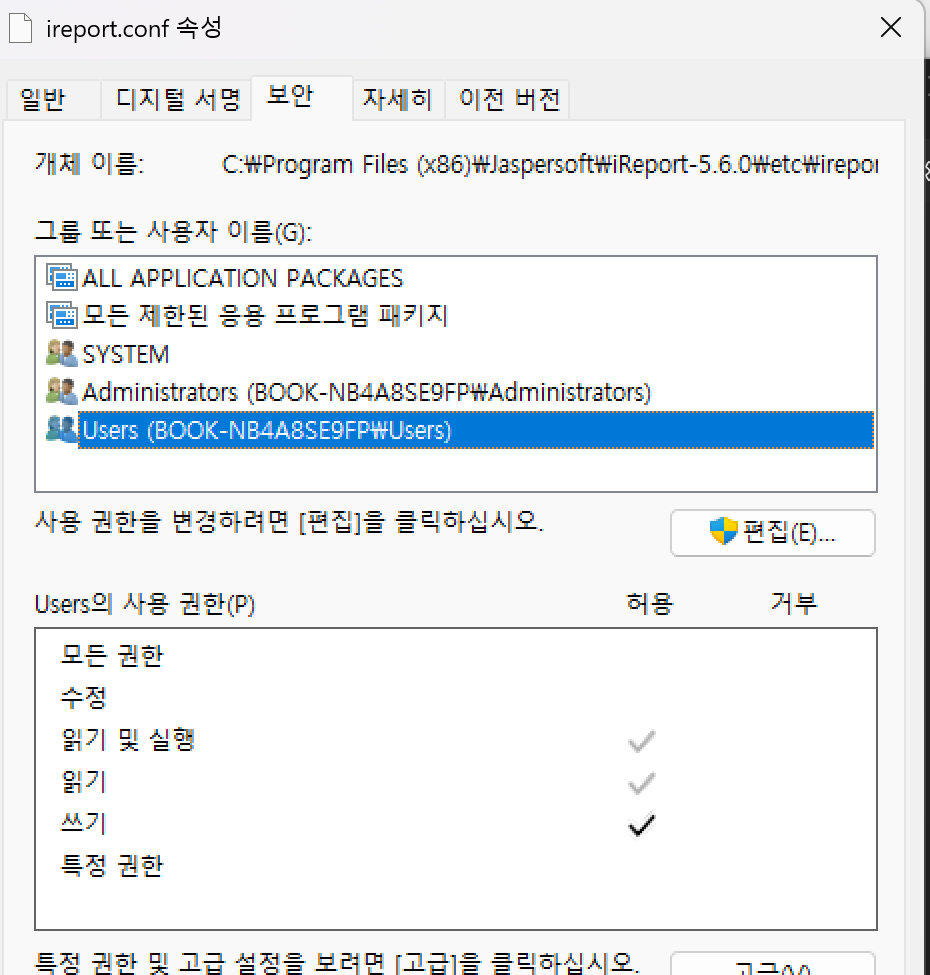 3.권한이 없다며 수정이 안될때 : ireport.conf 속성>보안>쓰기권한 부여