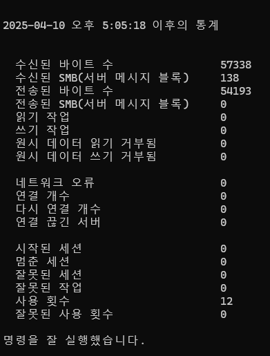 net statistics workstation 정의 : Windows에서 서비스의 네트워크 통계와 시스템 부팅시간을 확인하는 명령어 항목설명Statistics since시스템이 마지막으로 부팅된 시각Bytes received/sent네트워크로 주고받은 바이트 수Session failures연결 실패 수Read/Write operations원격 서버와의 읽기/쓰기 시도 수 IT/OS(Windows,Linux) 2025.05.13
